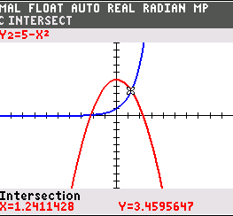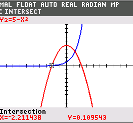 This solves the equation $\mathrm{e}^x = 5-x^2$, giving us the solution $x=-2.21 \quad \mathrm{or} \quad x=1.24 $ correct to 3 significant figures.