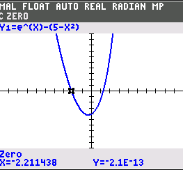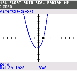 Solution to $\mathrm{e}^x = 5-x^2$: $x=-2.21 \quad \mathrm{or} \quad x=1.24 $.