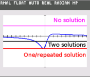 Let us go back to the graphs. Notice that for the values $y$ cannot take, if we were to draw a horizontal line across our graph it will not intersect the curve. Meanwhile, for the values $y$ can take, a horizontal line across our graph will cut the curve either once or twice. Recall we have a technique to distinguish the number of roots a quadratic equation has: the discriminant! We will use this concept in our solution.