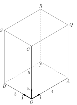 The diagram below shows a cuboid with base $OAPB$. $OA, OB$ and $OC$ are parallel to the $x$-, $y$- and $z$- axis respetively with magnitude $4,3$ and $5$ respectively.