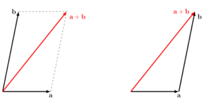 The alternative method, on the right, is to draw $\mathbf{a}$ and $\mathbf{b}$ "head-to-tail". Thereafter, we join the tail of the first vector to the head of the second, forming a triangle to visualize $\mathbf{a}+\mathbf{b}$.