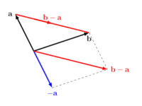 Vector subtraction is defined by a combination of vector addition and scalar multiplication. $\mathbf{b}-\mathbf{a} = \mathbf{b} + (-\mathbf{a})$. This is visualized in the diagram below. We will return to this picture in the next section on position vectors.